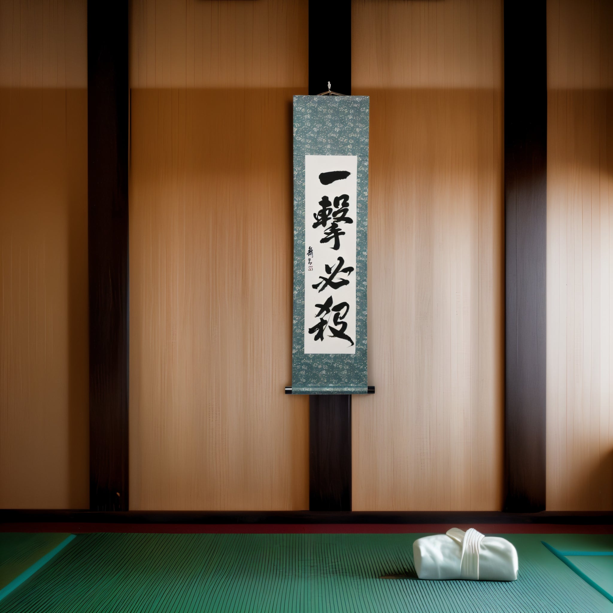 Embodying the core philosophy of Karate, this striking Japanese calligraphy scroll features the phrase 一撃必殺 (Ichigeki Hissatsu) — meaning “One Strike, Certain Kill”. It reflects the ideal of delivering a single, precise, and decisive technique that ends the conflict in an instant.