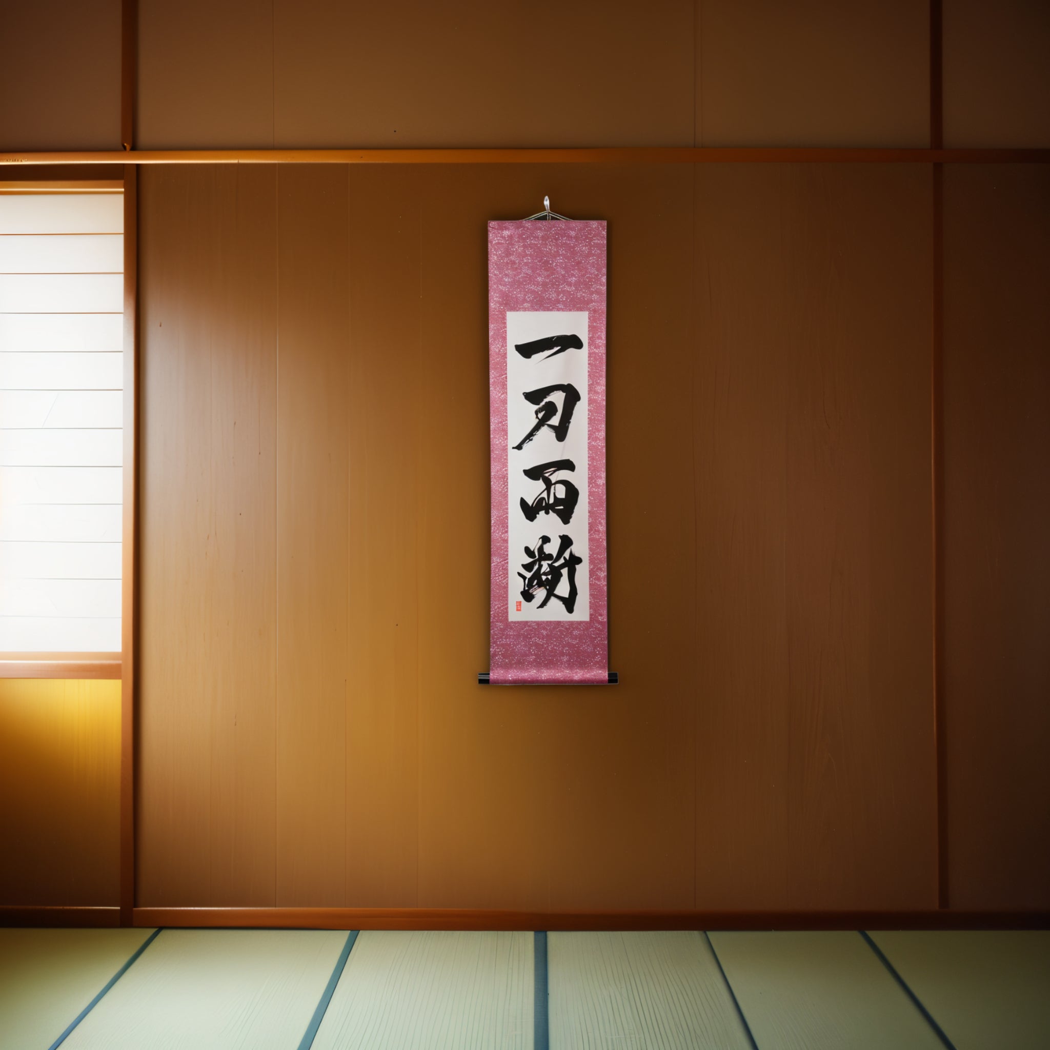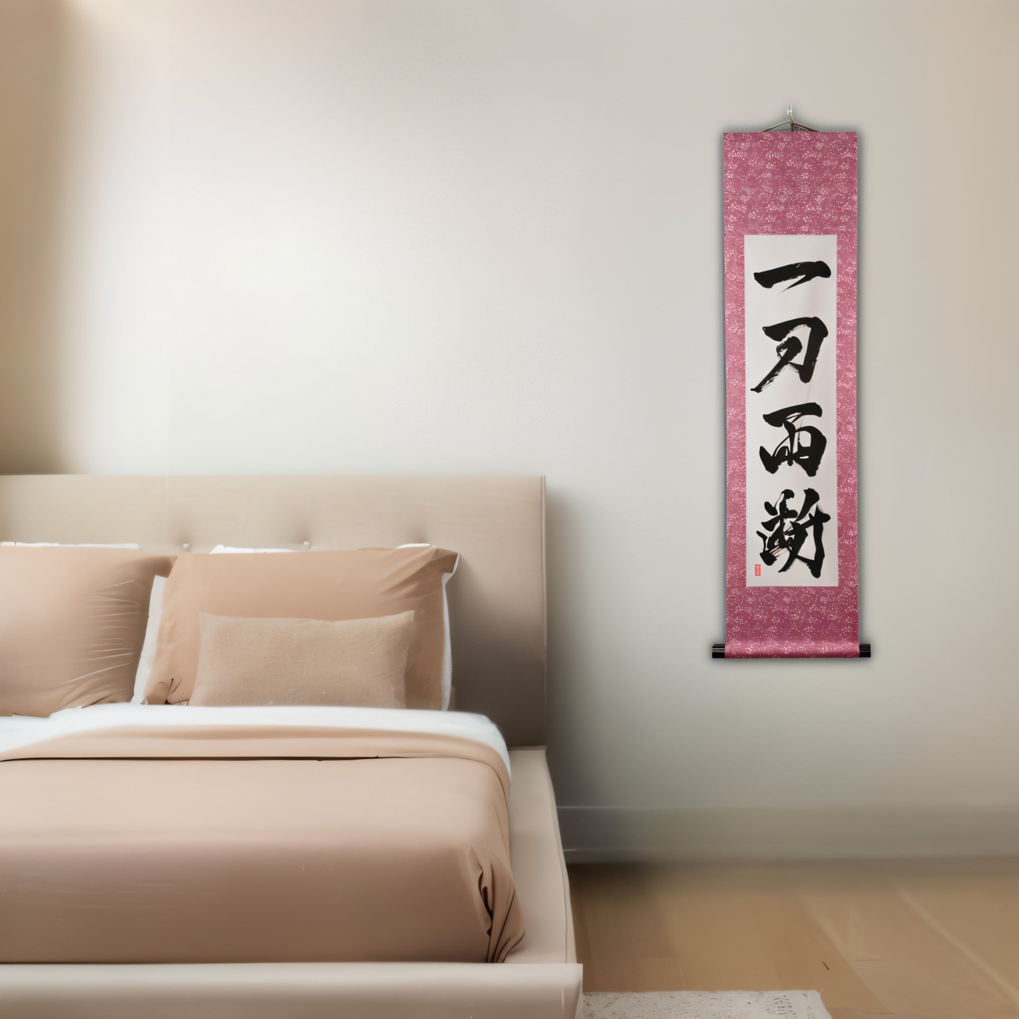This Japanese calligraphy scroll boldly displays the phrase 一刀両断 (Ittō Ryōdan) — a powerful expression that captures the unwavering decisiveness and clarity of the samurai spirit.