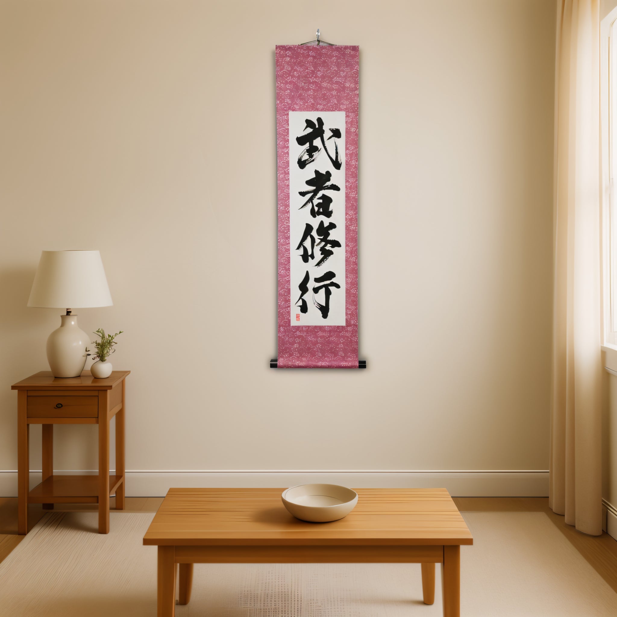 This Japanese calligraphy scroll embodies the essence of 武者修行 (Musha Shugyo) — the Samurai’s journey of self-discipline, growth, and mastery. Rooted deeply in the Samurai tradition, it represents a lifelong commitment to rigorous training and the pursuit of perfection in both skill and spirit.