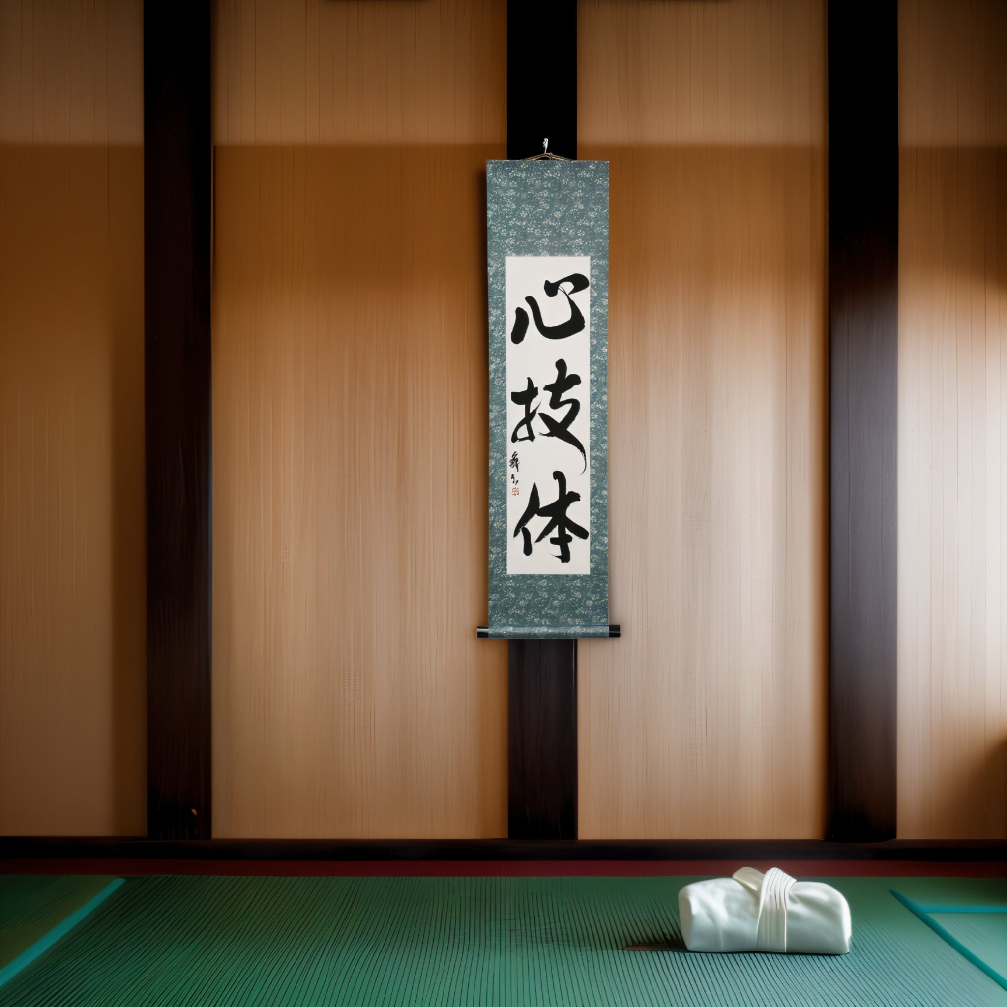 This Japanese calligraphy scroll features the revered phrase 心技体 (Shingitai) — the foundational concept behind all traditional Japanese martial arts, including Judo, Karate, Aikido, and more.